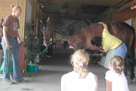 | Our day campers observe equine sports massage therapist, Cindy McVey, treat Lux |